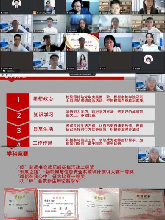初审,来自2019级、2020级和2021级的14名国奖申请人参加了本次答辩会。他们分别从自我介绍、思想建设、学习成绩、科创竞赛、实践创新、志愿服务等方面向评委们展现了自己在过去这一年的收获。整个答辩会历时两个半小时,过程紧凑有序,评委与选手之间有效互动。每位国奖申请人根据自身经历和实践体会,展现了大学生孜孜不倦的求学之路,热情洋溢的青春风采,不仅树立了我院学子的良好风貌,而且为低年级的同学做出了榜样示范和引领。