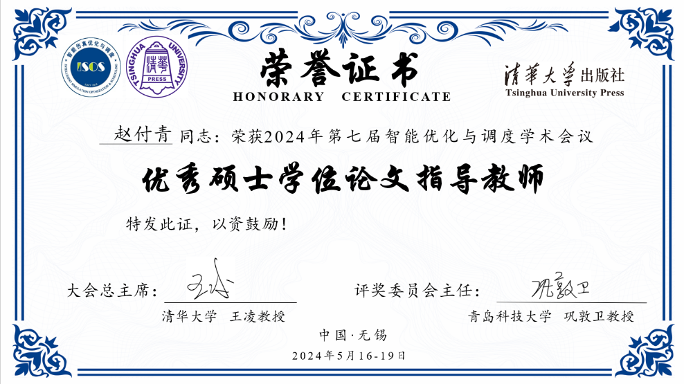 优秀硕士学位论文和甘肃省优秀硕士学位论文。赵付青教授荣获第七届智能优化与调度学术会议优秀硕士学位论文指导教师。(撰稿:朱宁宁;审核:高国礼)