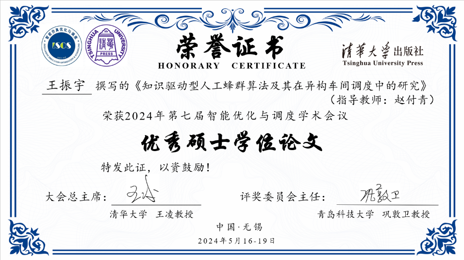 我校赵付青教授带领团队相关人员参加了本次会议,并进行了深入交流。经过激烈的竞争角逐,赵付青教授指导的2023届硕士生王振宇的硕士论文《知识驱动型人工蜂群算法及其在异构 车间调度中的研究》,入选智能优化与调度学术会议优秀硕士论文,这是桃子视频