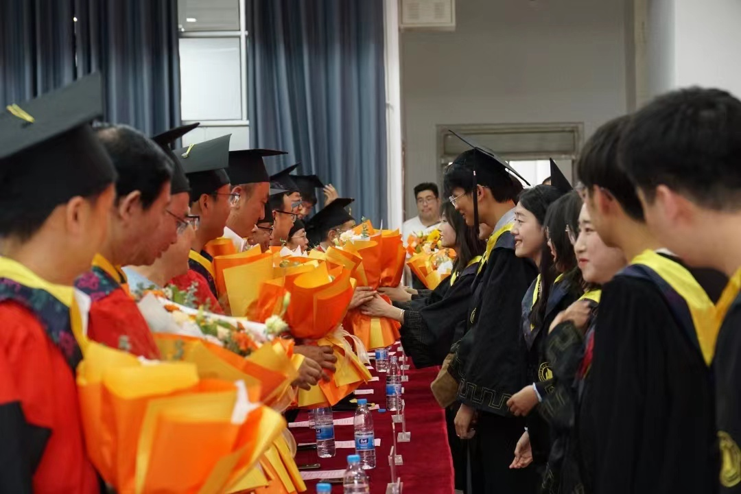 冯涛院长向为获得硕士学位的研究生毕业生代授予学位,拨苏正冠。导师们为获得学士学位的全体本科毕业生授予学位,拨苏正冠。
