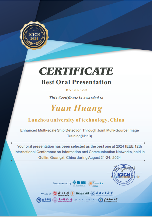 硕士生周根学、黄媛和张凌雲分别作了分会报告,石乐太同学进行了海报展示。周根学的报告题为《Integrated Design of OFDM-LFM Lidar Communication in IoV Environment》,黄媛的报告题为《Multi-scale Ship Detection Through Joint Multi-Source Image Training》,张凌雲的报告题为《Compressed Sensing Optimized OFDM-IM Lidar-Communication Integrated System》,石乐太的报告题目为《Dynamic Displacement Response TCN-BiGRU Prediction of Isolation Bearings》。值得一提的是,黄媛同学因其出色的报告获得了“最佳学生报告奖”。