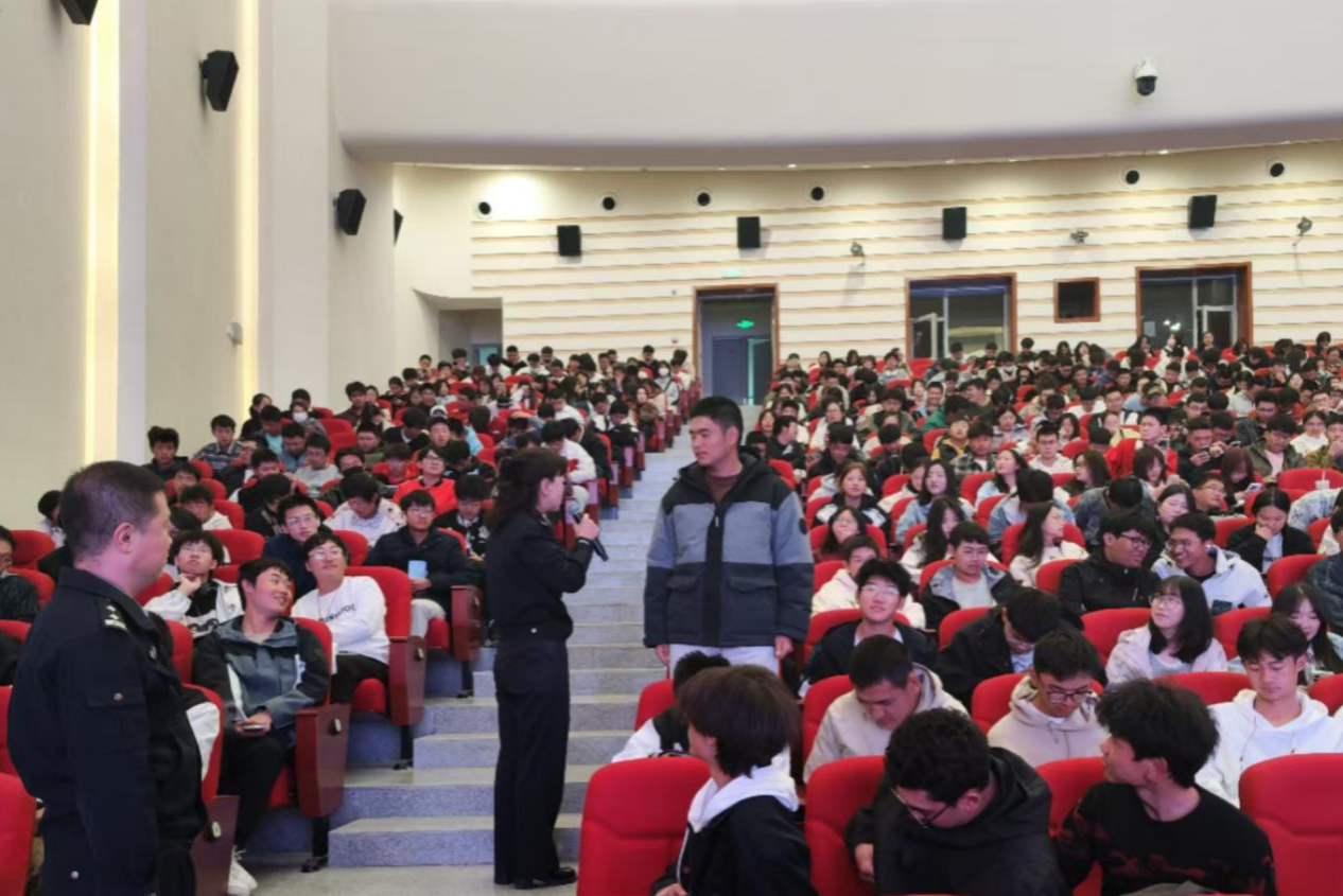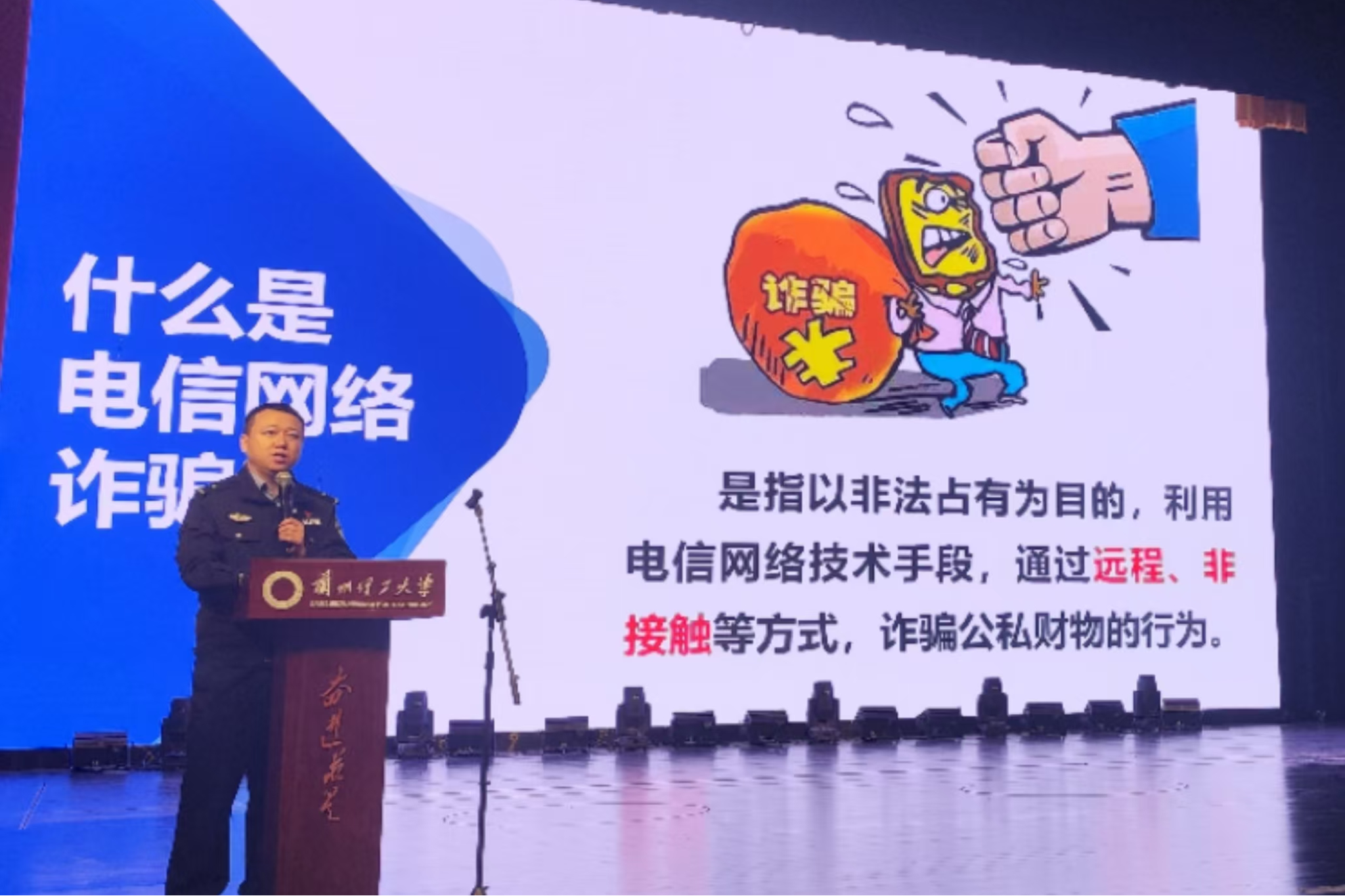 两位警官结合全省高校发生的典型案例,为同学们介绍了各种诈骗类型,从电信网络诈骗、虚假中奖、兼职刷单、冒充公检法骗取信任、盗用社交账号伪装借钱、杀猪盘等方面进行讲解,告诉同学们谨记“天上不会掉馅饼”,认清网络诈骗套路。