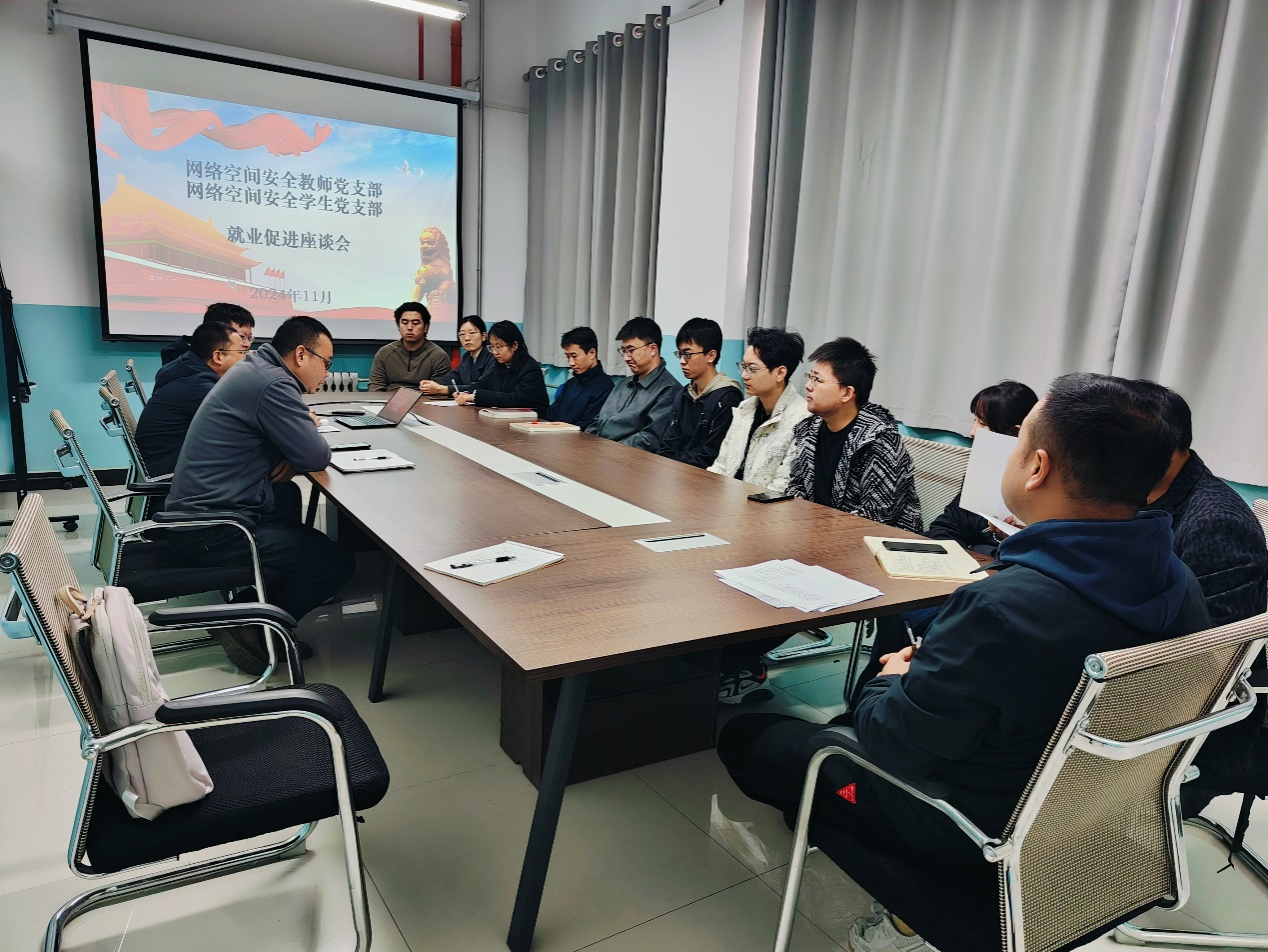 11月15日,网络空间安全专业教师党支部和学生党支部在彭家坪校区舒卷楼602研讨室,举办了主题为“师生党建引领,同心共建促就业”的师生党支部共建活动。网络空间安全教师党支部全体委员、学生党支部书记李建龙老师、辅导员张亮老师、班主任张迪老师、部分学生党员及毕业班学生代表参加了会议。会议由网络空间安全教师党支部书记蒋泳波主持。