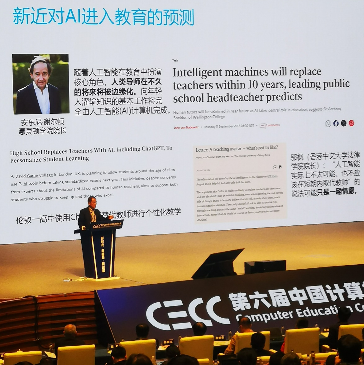 大会期间,众多知名专家学者发表主题报告,深入剖析计算机学科发展面临的新挑战与新机遇,分享人工智能赋能教育创新的实践经验,探讨互动式教学新模式以及大模型技术对教育变革的深远影响。教育部高等学校大学计算机课程教学指导委员会主任委员、中国工程院院士郑庆华(图1),中国科桃子视频