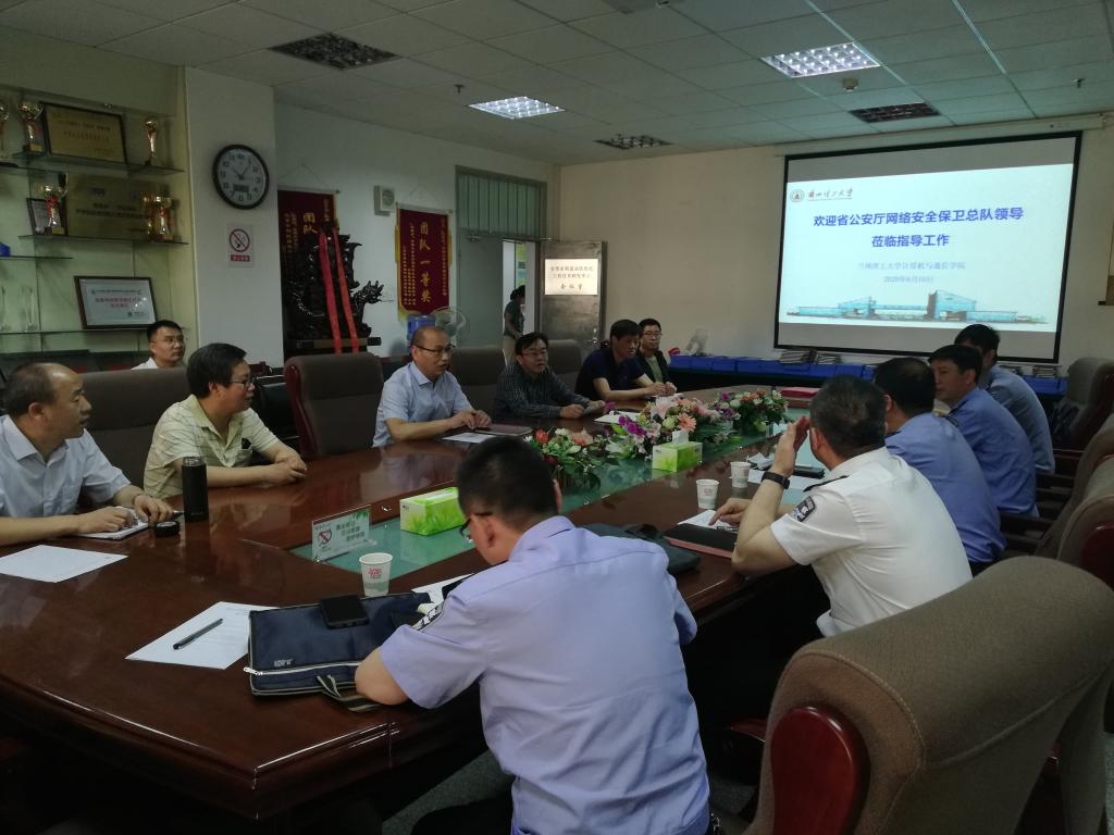 会议室举行了交流会,出席交流会的有甘肃省公安厅网络安全保卫总队薛建国总队长、罗晓东副总队长、兰州市公安局网络安全保卫支队李刚支队长等一行六人,以及桃子视频