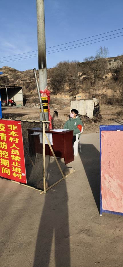 2018级动漫二班苏铭同学弘扬理工大“艰苦奋斗,自强不息”的红柳精神,积极响应党中央和国家号召,进一步发挥共青团在疫情防控中的作用,积极投身在战“疫”一线,从大年初二开始,成为了甘肃省庄浪县韩店镇刘河村的一名青年志愿者,在刘河村村委会的牵头下,在村里设置的劝返点24小时值班驻守,严防人员流动,对外乡入村人员进行劝返,抑制疫情发展。